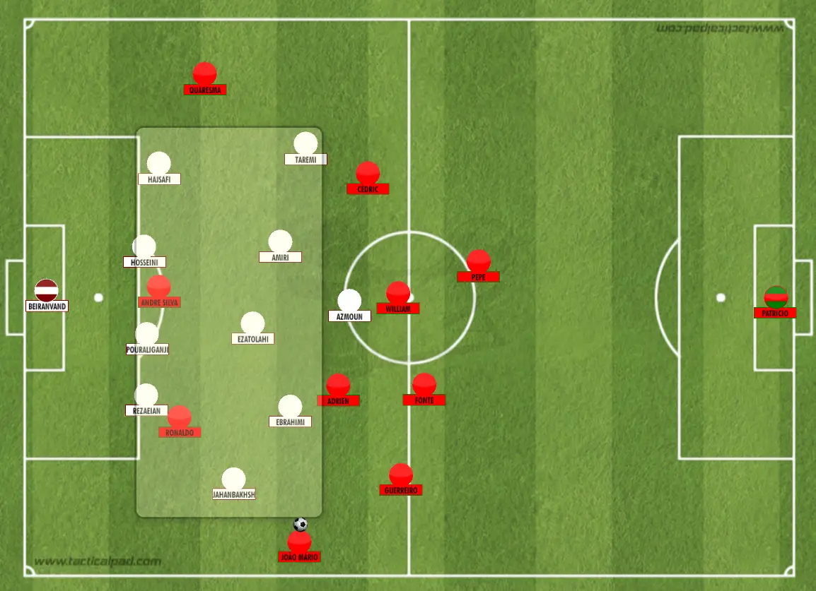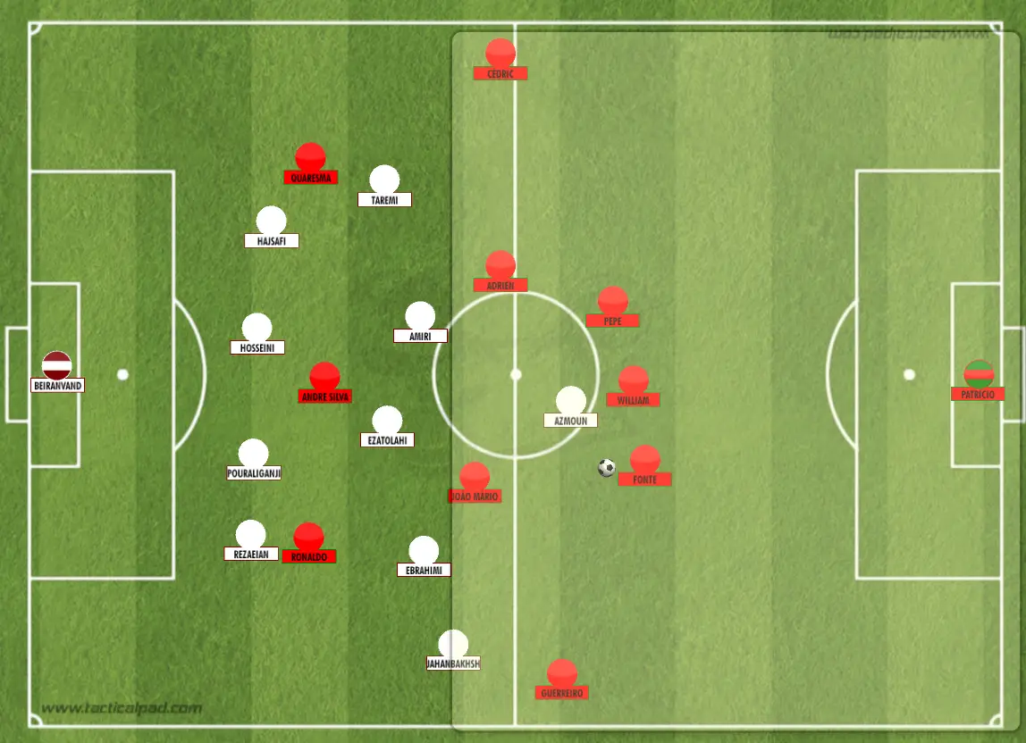 A maioria dos jogadores portugueses estão posicionados fora do bloco defensivo do Irão, onde não oferecem nenhum tipo de opção de passe interior nem procuram criar superioridades numéricas na zona da bola - o que dificulta, em muito, a criação de oportunidades de golo.